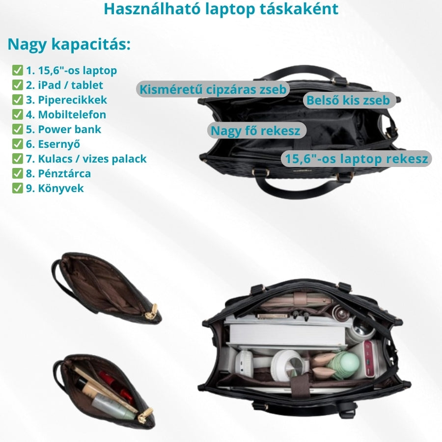Válasz 1: A táska elegendő helyet kínál egy 15,6 hüvelykes laptop számára, valamint dokumentumok, jegyzetfüzetek és más fontos eszközök tárolására, így mindig rendezett maradhat anélkül, hogy le kellene mondania a stílusról.
